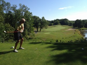 The River course can play 7,400 yards with a 76.2 rating and a slope of 151 if playing from the black tees. Even with the beautiful sunshine and golf-induced endorphin rush, my 12 handicap was not going to allow me to play the black tees. Five separate tee boxes exist to allow everyone the appropriate challenge. For this round Jim and I played the white tees which have a 70.3 rating and 132 slope. At the first tee box we were joined by Don and MaryAnn who traveled from New Jersey to golf here and our foursome was established. With a quick snap of my driver I started the day lying nicely in the middle of the fairway on hole 1. Unfortunately my game abandoned me for a few holes after my first tee shot, but it is always nice to start the round in the fairway. With water and elevation changes everywhere, accuracy with a driver and long irons is a must. The greens, as one would expect, are normally pretty fast at Blackwolf Run. With the US Open only a few days in the past, they were playing at PGA speeds. While fast they were true and fair, unfortunately for this round I carded four dreaded 3-putt greens. The #1 handicap hole on the course, hole 3 called “Gotcha”, requires a great drive that stays out of the huge sand bunker that runs 125 yards down the right side of the fairway approaching the green. Both Jim and I had great drives that left us 80 or so yards to the green, but it was Jim that owned the hole by sinking his 10 foot putt for birdie. Number 5, called “Made in Heaven”, was my favorite hole. The extremely elevated tee box allows a stunning view of the hole below and beyond. The drive here, aided by the elevation, will naturally (hopefully) be huge, but it must be on the left side to stay away from the large fairway bunker. Landing well down the fairway after a good tee shot will not complete this hole. The elevation to the flagstick here seems to be almost as high as the tee box leaving a second shot with a view to the approachable green. A miss from here by a just a few feet to the right will result in a ball rolling heartbreakingly down the 60ish foot drop towards the water. Don had a sturdy chip shot from down there that seemed like it would never get high enough. The River course ends with “Dyehard”, clearly named after Pete Dye, which is a 510 yard long par 4 that brought us up back to the huge and beautiful clubhouse made from Canadian pines. Interestingly, hole 18 on the River course shares a huge green with hole 18 from the Meadow Valleys course. My Titleist was on the green in regulation and only 10 feet from the pin; unfortunately the wrong pin and was left with a put that had to be 100 feet (there was one of my 3-putts). A good score on the River course requires the ball to stay in play; unfortunately my 4 penalties led me to shoot 95 (missing my goal of shooting in the 80s).