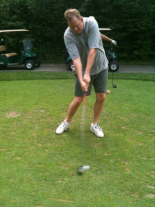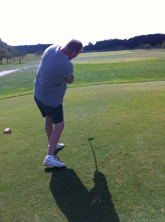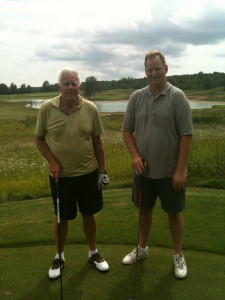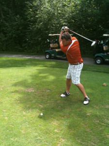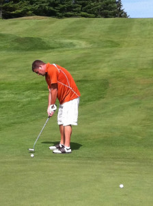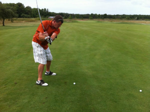 I really enjoyed the four-hole stretch from number 10 through 13. Hole 10 is a par 4 with a good sized driving zone that doglegs slightly to the right. The green is protected by a large sand trap and wide grassy swale. Fortunately both my drive and second shot were played well, however my birdie putt ran past the cup – I’m on vacation, a par is nothing to cry about. Hole 11, running about 200 yards, is the longest par 3 on the golf course. The approach to this hole is sided by trees on the right and a meadow on the left. My tee shot on this hole was the shot of the day. From the moment it left the tee box it tracked directly for the flagstick; coming to rest only a putter-length past of hole for nice birdie. A “2” on the scorecard always looks great. Hole 12 is a long par 4 with the green sitting up at the top of a hill. Take my advice and don’t hit your drive off to the right. Not only will you be out of bounds, but you might be making friends with campers sitting around roasting marshmallows adjacent to the course. My second shot to the green was slowed down by the large hill and the slick greens would not allow my par putt to fall. Hole 13 is the one that many people call this course’s “signature hole” because the green is located next to Highway 42 (the main road through Door County). The pond just to the right and beyond the green has a large fountain and a retaining wall displaying “The Orchards” name and logo. A well struck big drive over the crest of the fairway can leave you a very makeable sandwedge shot to glory. My father had a great drive and second shot, but was an inch short for his birdie. I was ready to run with the classic “Hey Dad, it is time to take off Mom’s dress” line, but I could not make my putt either.