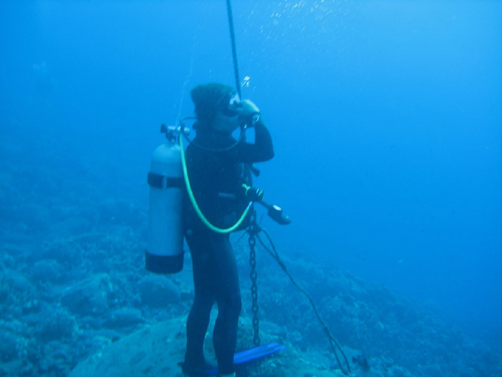 From the anchor point of the mooring line, deep under the sea, we spotted a most incongruous site.  Scuba divers affixed to the rocks and sand of the ocean floor spread out in a circle with lights shinning upward like a mystifying campfire.  We swam over to an open spot in the circle and politely settled down to the bottom ourselves.  To our total amazement and delight two huge male manta rays joined the campfire and began putting on an acrobatic show for us.