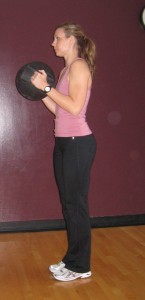 – Hold the medicine ball in front of you, parallel with the floor, tighten your abs and lead with your shoulders to move the medicine ball side to side.
