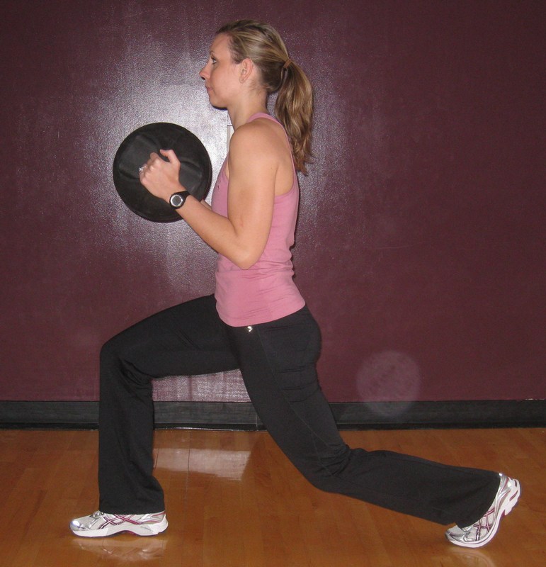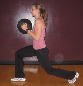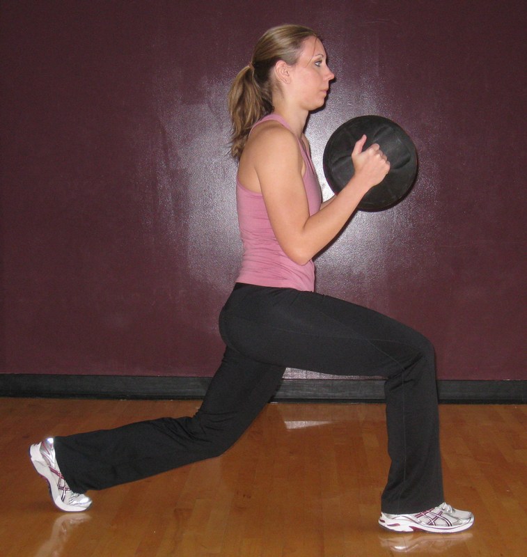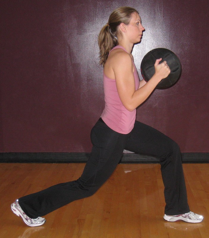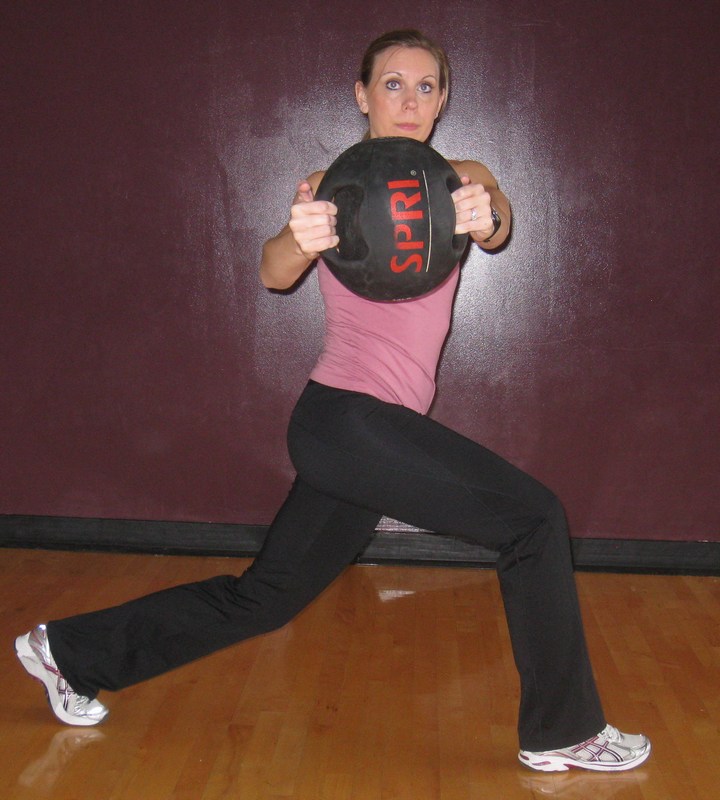 · Exhale, pull the medicine ball back to your chest and push all of your weight through the heel of your right foot to come back to the starting position.