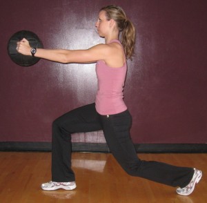 · As you step forward, press the medicine ball away from your chest, arms parallel to the floor, with a slight bend in the arms.