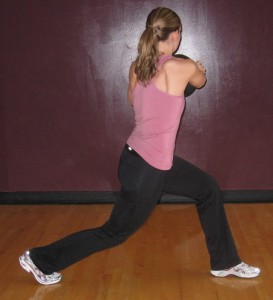 – Plant the ball of your right foot on the floor and sink into the lunge position. Both legs should be bent at a 90-degree angle.