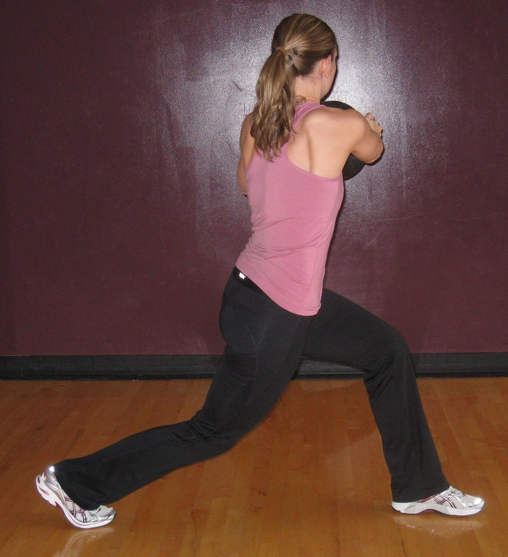· Plant the ball of your right foot on the floor and sink into the lunge with both legs meeting a 90-degree angle.