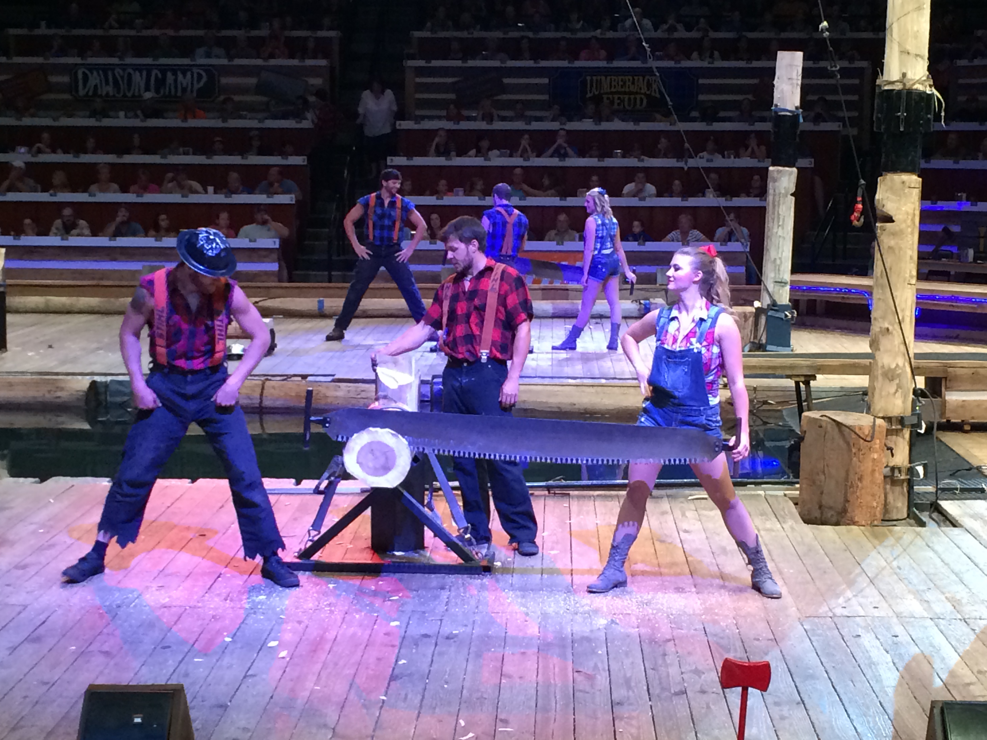 Lumberjack Feud Entertainment is another highlight for the Gatlinburg / Pigeon Forge area. During our stay we spent a truly fun evening attending the Lumberjack Feud Dinner Show. This show is roughly 2 hours full of high energy entertainment. The evening starts with Tennessee bluegrass music and dancing clearly intended to get the audience to participate. Once the audience is seated, riled up and ready to go, the show format is explained to all. Sides are picked: the Dawson and the McGraws, and the feud is on! After the National Anthem is sung, these logging families duel for the logging (and bragging) rights to audience applause and cheers. In the meantime a hearty dinner of chicken, soup, potatoes, corn, and dessert is served – you will not leave hungry. The audience is seated in gradually tiered rows on three sides of the arena ensuring that everyone has a great view of the action. Clearly these lumberjack entertainers are true athletes and the competition is real. The competition is made up of 18 different events each requiring strength, precision, and endurance. Up close you get to witness chain saw cutting races (hot saw and stock saw), hand saw races (single and double buck), axe cutting races (standing block, underhand chop, and springboard) log rolls, and speed poll climbing. In addition, and our favorite, there were extreme launch dog jump competitions with the Timberdogs. After the show is over, these tremendous athlete entertainers make themselves available for questions, pictures, and autographs. Stealing a bit from the brochure this evening was “Axe-tion” packed fun.