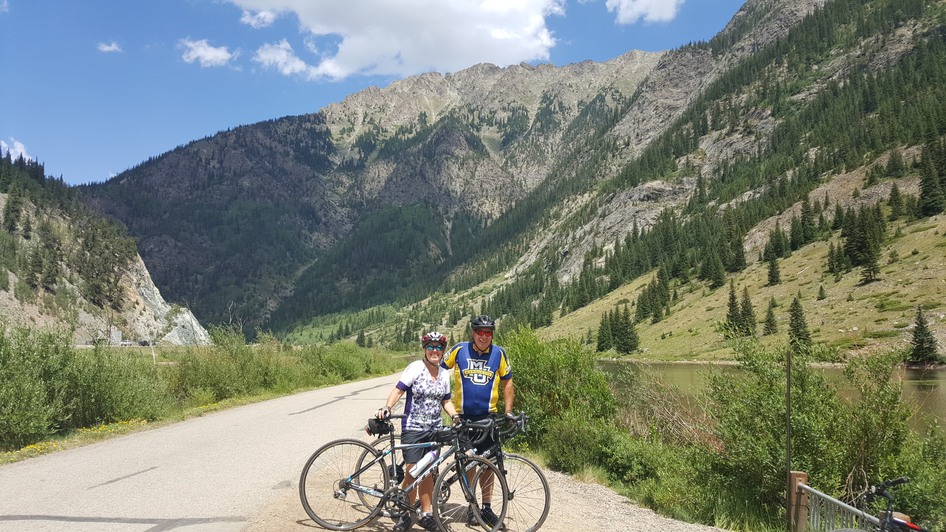 It’s worth taking the time to park bikes and walk the small circle at Sapphire Point. The views from up there can’t be beat. It’s a very popular spot for visitors to drive up and take the short walk, and also popular for small weddings at the overlook. Riding the down-route from Sapphire Point towards the Blue River is the only section of this route where cyclists actually ride ON THE ROAD. I would advise extreme care on this 1.5 mile stretch as cars may be jockeying or passing on this steep downhill section. At the bottom of this section, riders will cross Hwy-9 and rejoin the Recpath and head toward the town of Frisco.